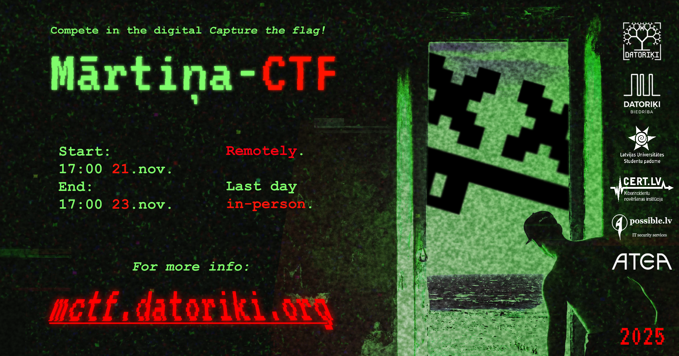 From November 21 to 23, the digital adventure returns — Mārtiņa-CTF 2025 invites participants from all over Latvia and beyond to 48 hours of intense cybersecurity challenges. This will be the third edition of Mārtiņa-CTF — a “trilogy” promising even more challenges, creativity, and surprises.