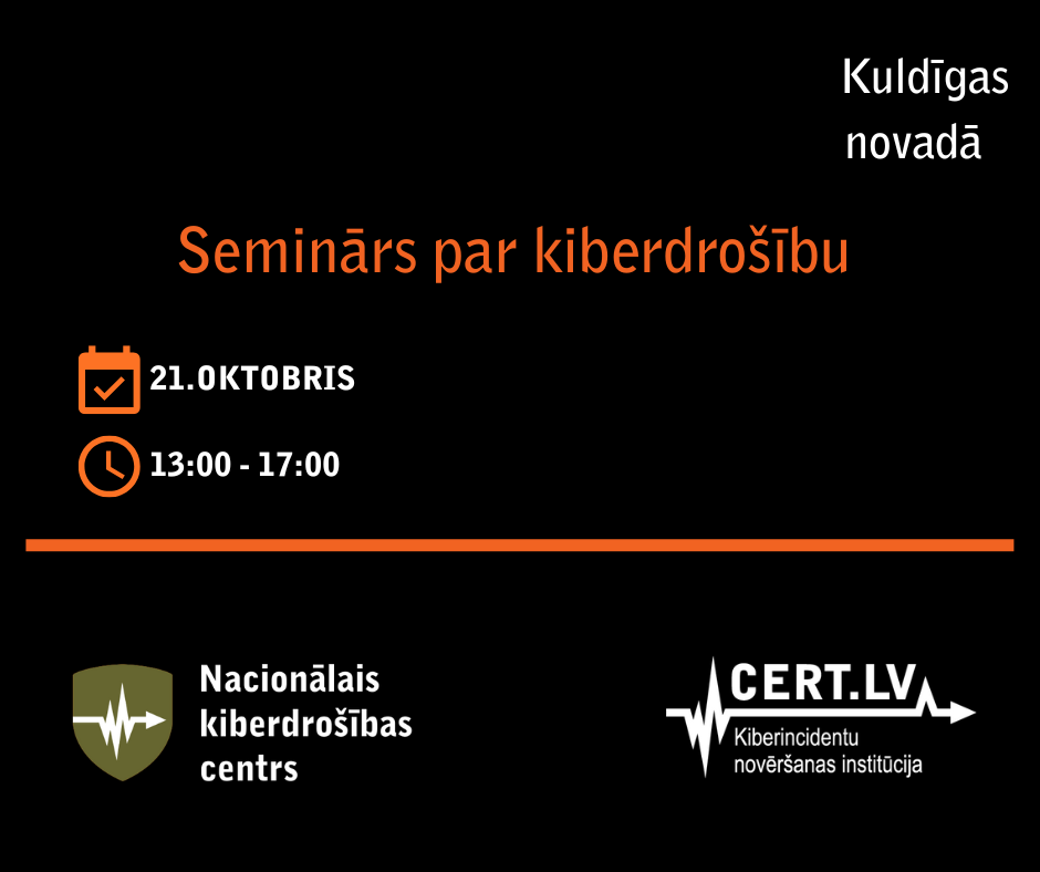 Otrdien, 21. oktobrī, Kuldīgas novadā norisināsies seminārs, kura mērķis ir veicināt iedzīvotāju izpratni par kiberdrošību, tās nozīmi, kā arī informēt un sniegt praktiskas zināšanas par kiberdrošības stiprināšanu.