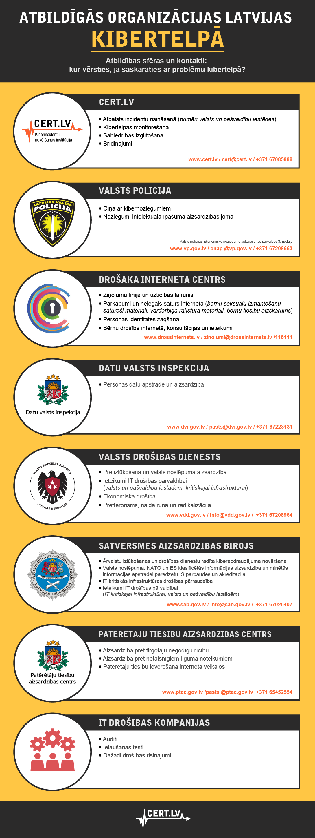 Izaicinājumi un problēmsituācijas, ar kurām ikdienā saskaras interneta lietotāji, mēdz būt dažādas. Tādēļ, lai zinātu pie kā vērsties pēc palīdzības vai padoma, esam apkopojuši informāciju par atbildīgajām organizācijām Latvijas kibertelpā. Informācija apkopota gan par atbildības sfērām, gan arī norādīti katras iestādes kontakti tālākai saziņai.