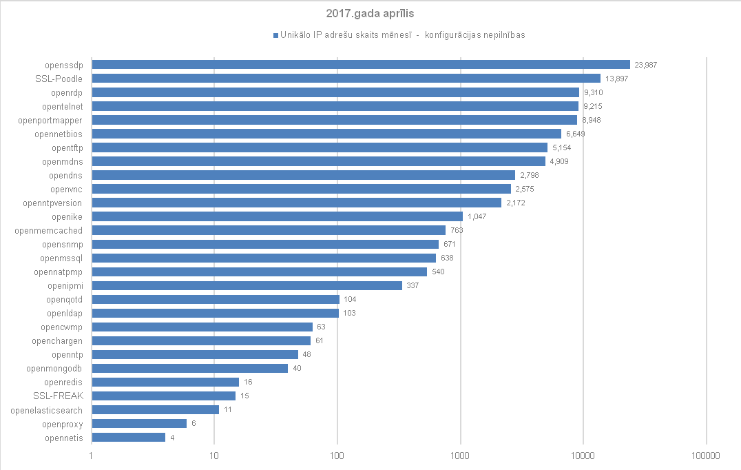 CERT.LV reģistrēto unikālo IP adrtešu skaits 2017. gada aprīlī ar apdraudējuma veidu - konfigurācijas nepilnības