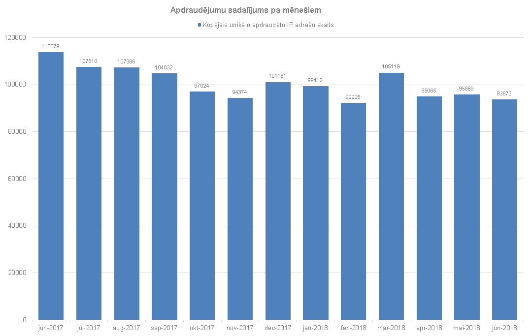 CERT.LV reģistrēto apdraudēto unikālo IP adrešu skaits 2018. gada jūnijā pa apdraudējumu veidiem