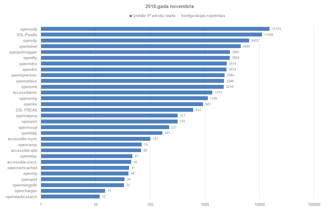 CERT.LV reģistrēto unikālo IP adrešu skaits 2018. gada novembrī ar apdraudējuma veidu - konfigurācijas nepilnības