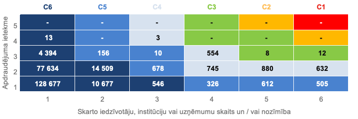 Kopš 2020. gada CERT.LV izmanto Apvienotās Karalistes Nacionālā kiberdrošības centra (NCSC) izveidoto apdraudējumu matricu. Tas, cik būtiskas sekas šis apdraudējums radīja vai radīs (Y ass), kā arī tas, cik nozīmīgu iestādi, uzņēmumu, vai cik plašu sabiedrības daļu apdraudējums ietekmē (X ass), nosaka to, kāda svarīguma kategorija attiecīgajam apdraudējumam tiek piešķirta (C6-C1). Apdraudējumi tiek ievietoti matricā, veidojot tādu kā temperatūras karti (heatmap). Tajā redzams, cik daudz apdraudējumu atrodas katrā svarīguma kategorijā, sākot no zemākās (C6) līdz pat augstākajai (C1).